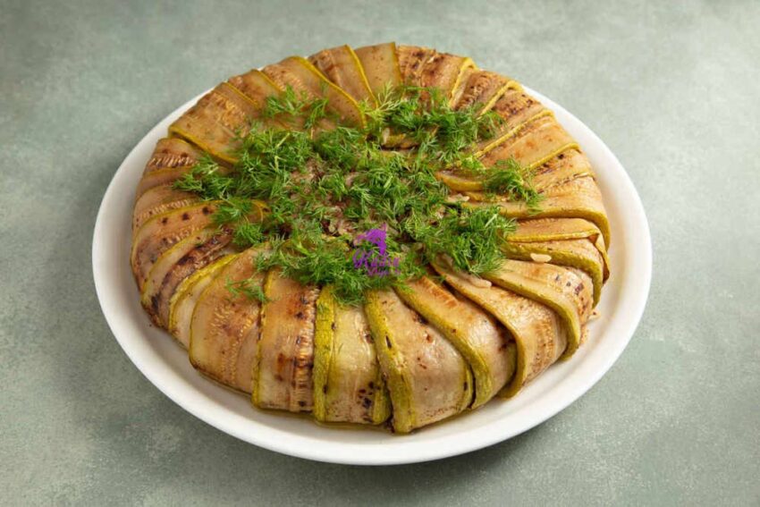 Pilav yaptığınız tencereyi bir havlu kağıtla silin. Izgara kabaklarınızı pilav tencerenize ortasında boşluk kalmayacak ve birbiri üzerine gelecek şekilde dizin. Üzerine hazırladığınız pilav harcını koyun ve yayın. Üzerine defne yaprağını koyun ve kenarlardaki kabakları üzerine kapatın. Suyunu ilave edin ve pilavınızı ocağa alıp kapağını kapatın. Pilavınızı kaynayana kadar orta, kaynadıktan sonra kısık ateşte pişirin. Pişen pilavınızı 15 dakika dinlendirin. Dinlenen pilavınızı ters çevirin ve ince kıydığınız dereotuyla servis edin.